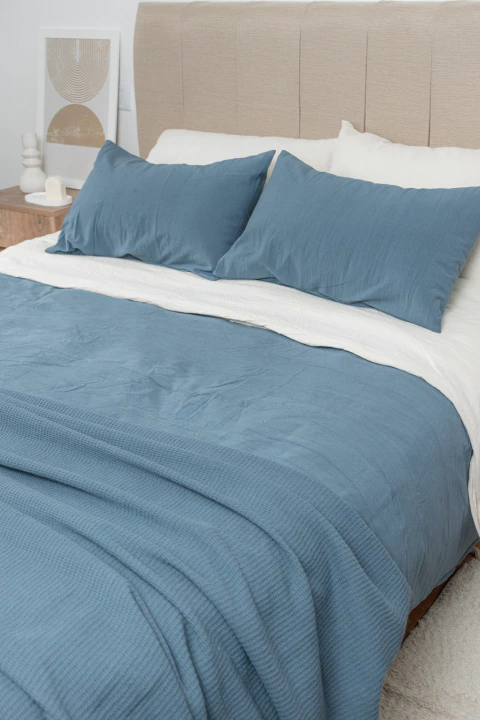 Incluye una Funda de Edredón (también llamado Cubre Edredón) en Tusor bicolor (Azul Acero de un lado + Reverso Natural) + 1 Manta Pie de Cama Nido color a elección + Fundas de almohadas en 2 medidas en Tono Natural y Azul Acero.