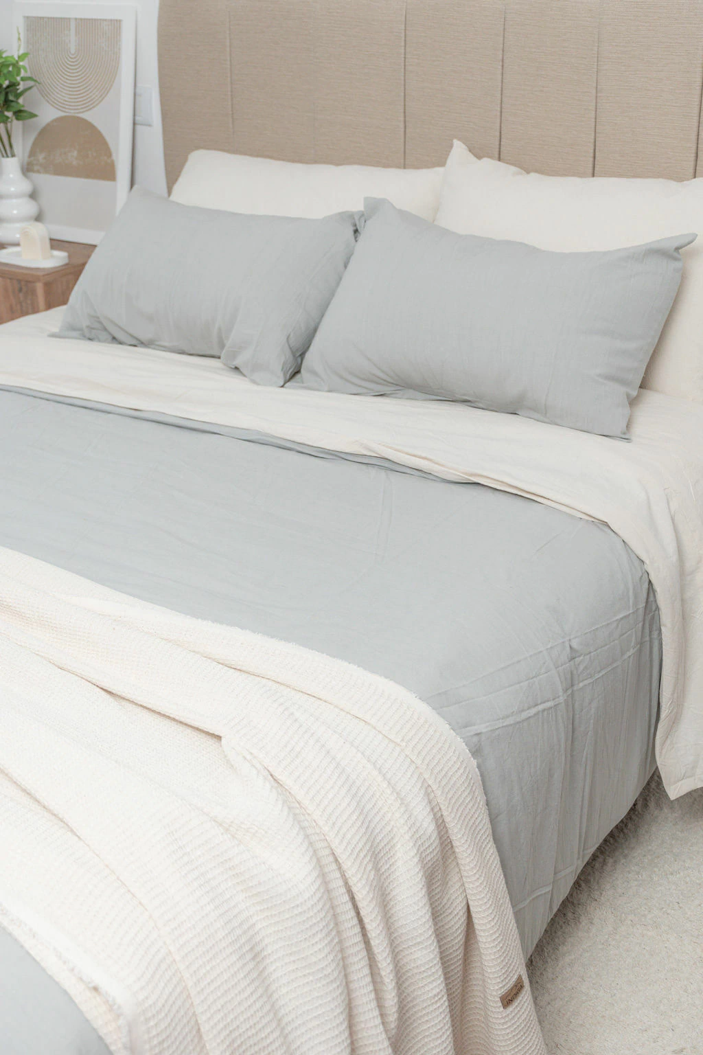Incluye una Funda de Edredón (también llamado Cubre Edredón) en Tusor bicolor (Perla de un lado + Reverso Natural) + 1 Manta Pie de Cama Nido color a elección + Fundas de almohadas en 2 medidas, en tono Natural y Perla)